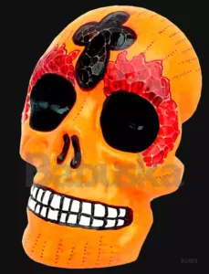 Calavera Skuli es el nombre de esta pieza de yeso (B1401). Esta calavera es un modelo de calavera colgante, realizada con diversas pinturas flúo, con un acabado brillante único. Decorada con detalles en jacarelado.